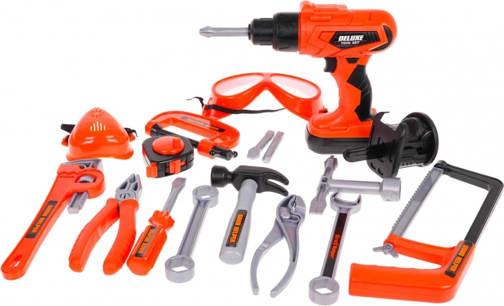 werkbank ca. 25 cm x 21,8 cm x 34 cm, .- werkbank ca. 39 cm x 21,8 cm x 34 cm, .- boor/schroevendraaier ca. 17 cm x 16 cm x 5 cm, .- hamer ca. 15 cm x 8,5 cm x 3 cm, .- tang ca. 16 cm x 5,5 cm x 1,5 cm, .- lange schroevendraaier ca. 15,5 cm, .- sleutel ca. 17,5 cm lang, .- steeksleutel ca. 14,5 cm lang, .- sleutel voor los- en vastdraaien van schroeven ca. 9 x 11 cm, .- handzaag ca. 25 cm x 10 cm x 2,5 cm, .- kettingzaagbit ca. 11 cm x 8 cm, .- plug ca. 5 cm x 3 cm, .- schroef ca. 4,5 cm x 3 cm, .- klem ca. 13,3 cm x 7 cm x 2 cm, .- moersleutel ca. 23 cm x 6 cm x 2 cm, .- veiligheidsbril ca. 16 cm x 6,5 cm x 4 cm, .- meetlint ca. 6,5 cm x 5,5 cm, .- veiligheidsmasker ca. 8,5 cm x 8 cm x 3,5 cm, .- verpakking ca. 35,5 cm x ca. 22 cm x 22,5 cm, . |
