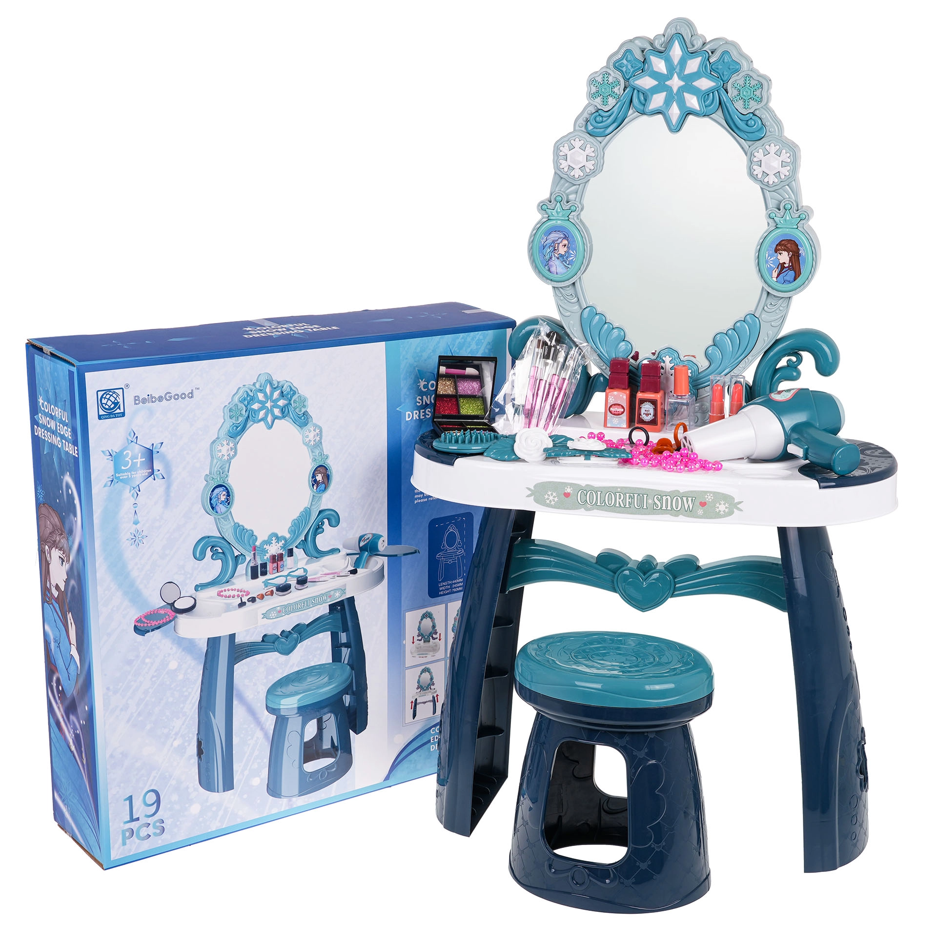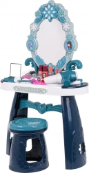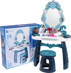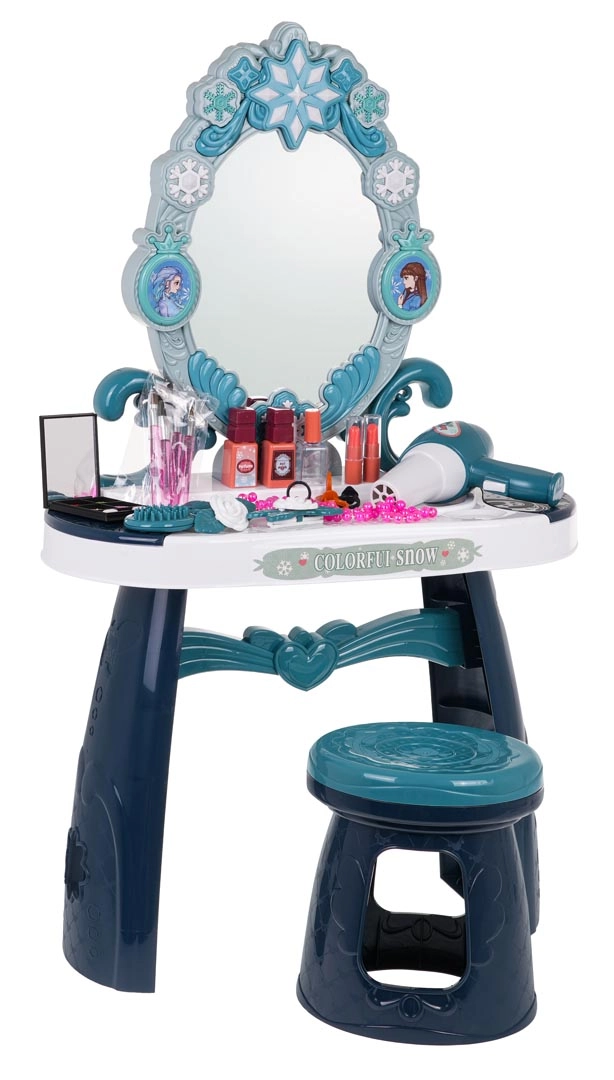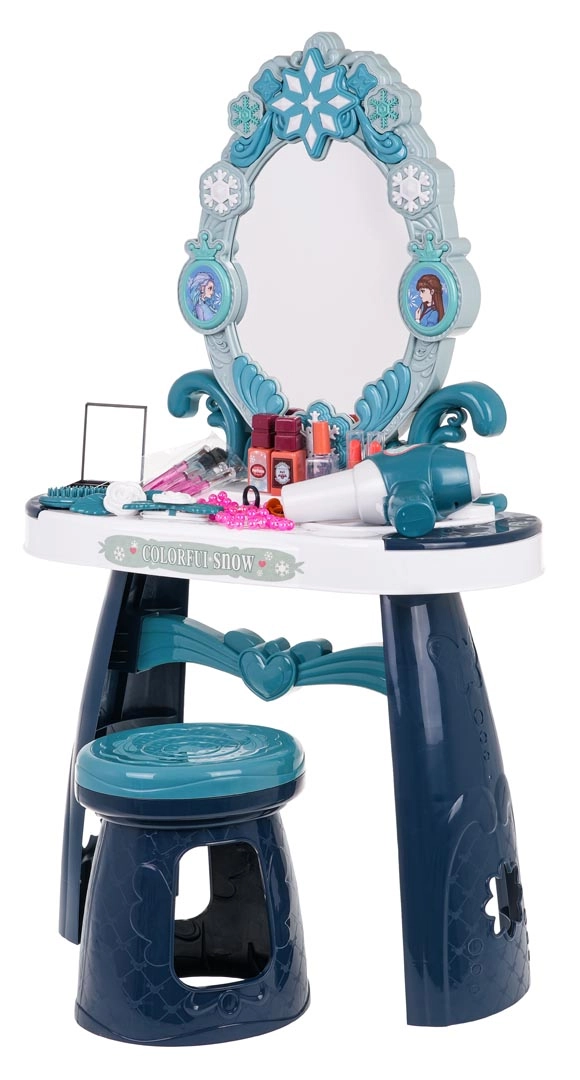 - bedoeld voor kinderen vanaf 3 jaar, .- gemaakt van kunststof van de hoogste kwaliteit in heldere kleuren, .- mooi versierde spiegel, .- geluidseffecten, .- lichteffecten, .- ruim tafelblad van de kaptafel, .- stabiele constructie, .- comfortabele stoel, .- föhn met drooggeluiden, .- breed assortiment make-upbenodigdheden. .