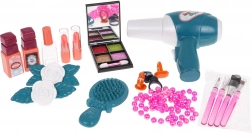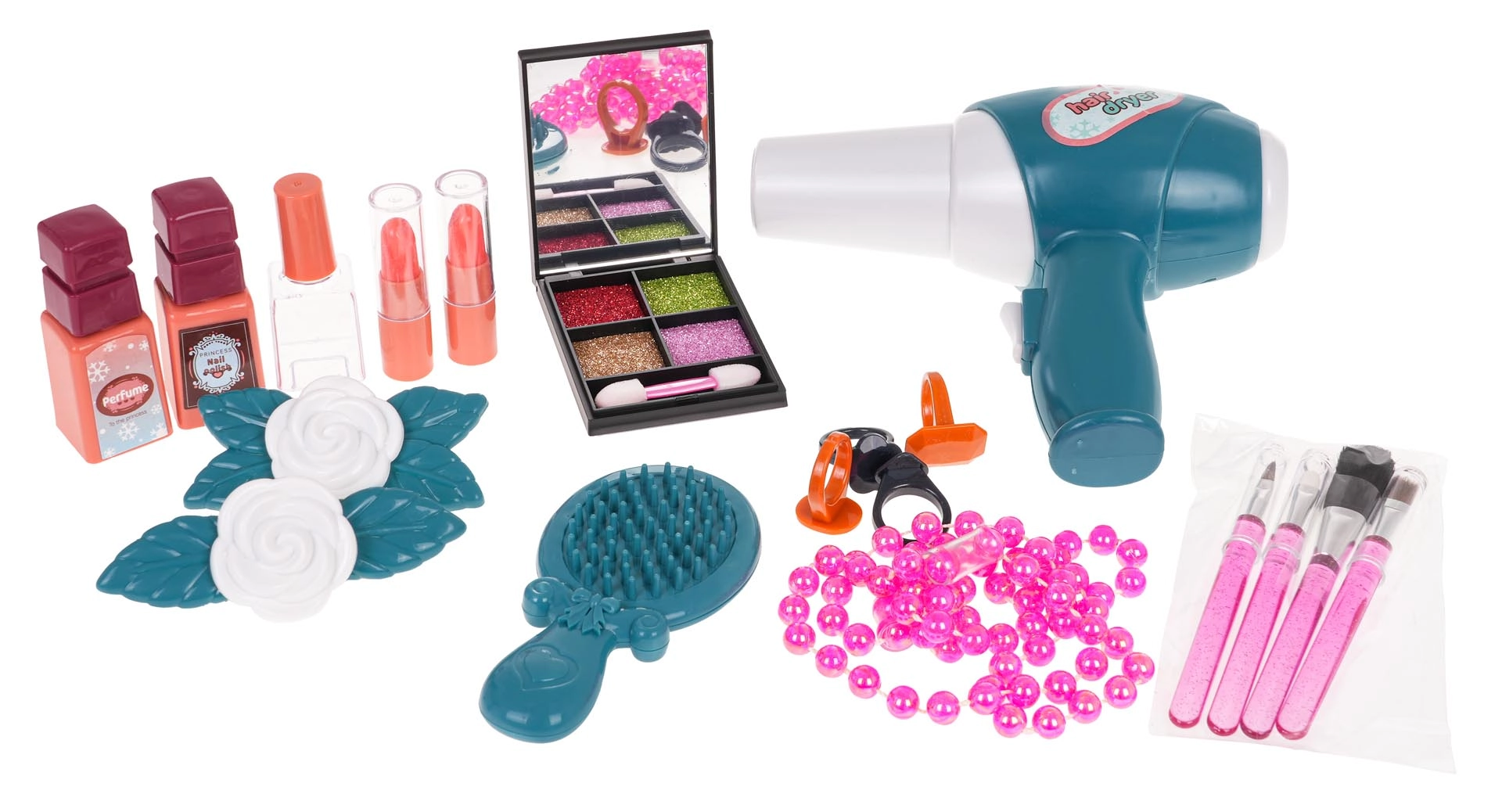 - kaptafel, .- krukje, .- föhn, .- kralen, .- armband, .- 2 x nep-lippenstift, .- nep-nagellak, .- nep-parfum, .- potje voor cosmetica, .- 2 x haarspeld, .- haarborstel, .- 4 x ring, .- cosmetictasje met spiegeltje, kwast en oogschaduwfiguurtje, - 4 x schilderkwast, . |