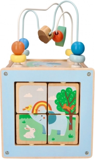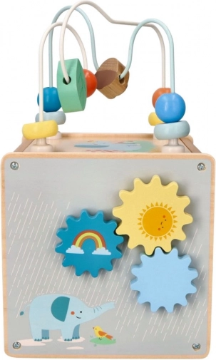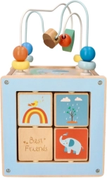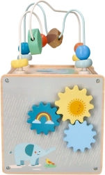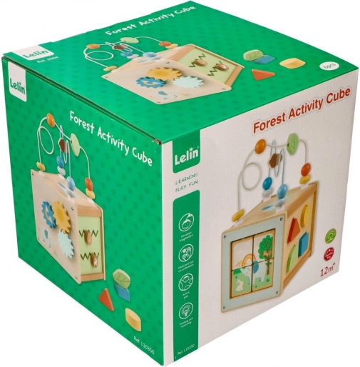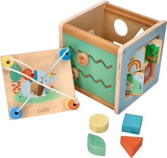 Deze hoogwaardige houten activitykubus van LELIN biedt aan elke zijde een afwisselende activiteit. Kleurige kralen op draden, labyrinten, vormen sorteren en tandwielen houden de aandacht vast en stimuleren op natuurlijke wijze vaardigheden, creativiteit en geduld.