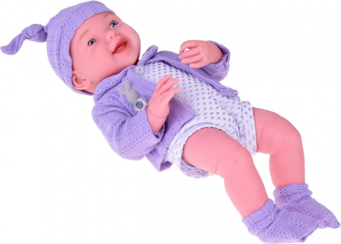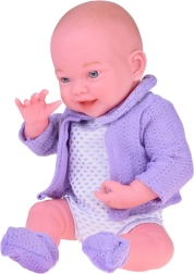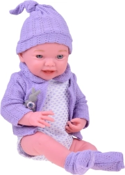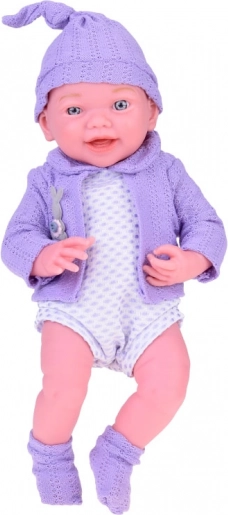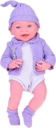De set bevat een stijlvolle uitzet: een licht rompertje met paars patroon, een zacht gebreid vestje, een mutsje en sokjes perfect op elkaar afgestemd. Een geweldig cadeau voor kinderen die graag voor een baby zorgen en spelenderwijs hun sociale vaardigheden ontwikkelen.