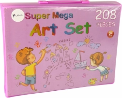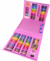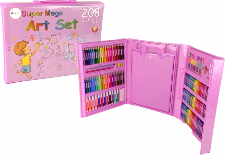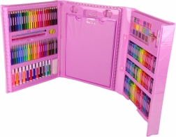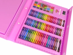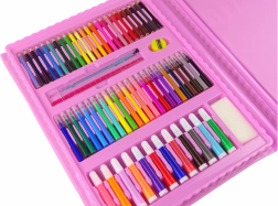 Deze roze creatieve koffer biedt een rijke selectie aan tools voor kleine kunstenaars: viltstiften, kleurpotloden, waskrijtjes, oliepastels, aquarelverf en praktische accessoires. Dankzij de overzichtelijke indeling heeft het kind alles bij de hand en kan het zich volledig op het creëren richten.