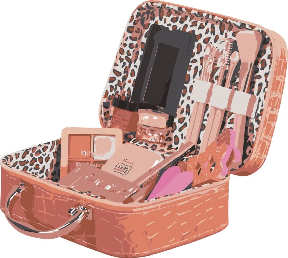 Make-upkoffertje. Afmeting 19 cm. Bevat een spiegeltje, kunstnagels, lipgloss, blush, oogschaduw, nagelvijltjes, een set kwasten, lipbalsem, eyeliner en glinsterende decoraties.