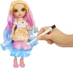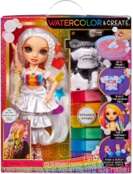 De RAINBOW HIGH watercolor-pop brengt een oneindige dosis creativiteit. Dankzij de witte outfit en het lichte haar dient ze als het perfecte ‘canvas’ waarop je ombré-effecten, tie-dye en subtiele overgangen kunt uitproberen. Strooi de poeders gewoon in water en maak met de spons of door onderdompelen unieke patronen. Klaar? Spoel de kleur met water af en begin opnieuw.