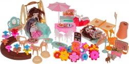 Inclusief volledig meubilair, tuinschommel, parasol, dieren en een scooter. De drie poppen hebben beweegbare ledematen en lang haar dat perfect is om te kammen.