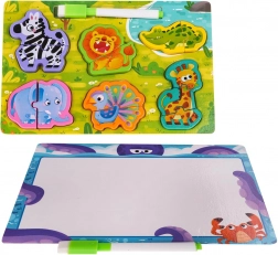 Dubbelzijdig houten bord met diertjes voor kinderen vanaf 3 jaar combineert creatief tekenen met het leuke leggen van puzzels. Aan de ene kant dient het als whiteboard voor uitwisbare stift, aan de andere kant als ondergrond met jungleprint en uitsparingen voor houten dieren (zebra, leeuw, olifant, pauw, giraffe, krokodil). Hoogwaardige houtbewerking in levendige kleuren stimuleert de fijne motoriek, oog-handcoördinatie en het leren vormen te koppelen.