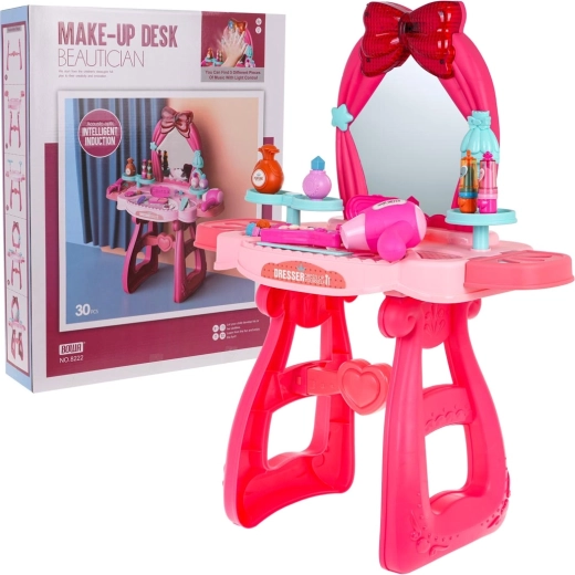 Deze stijlvolle roze kaptafel met grote spiegel en iconische strik maakt elk kind blij dat van rollenspellen houdt. In de verpakking vind je een uitgebreide set accessoires – van föhn en haarstijltang tot lippenstiften, nagellakken, ringetjes en een armband. De spiegel is voorzien van slimme inductie – bij beweging worden lichteffecten en melodieën geactiveerd.