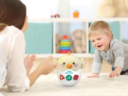 De intuïtieve bediening is ook voor kleine handjes eenvoudig: de notenknop start 12 zachte slaapliedjes, andere knoppen bieden vogelgeluiden en 6 vrolijke effecten voor actief spelen. Dankzij de afgeronde basis wiegt het kuikentje na een duwtje vanzelf en keert het terug, wat de motoriek en aandacht van het kind stimuleert.