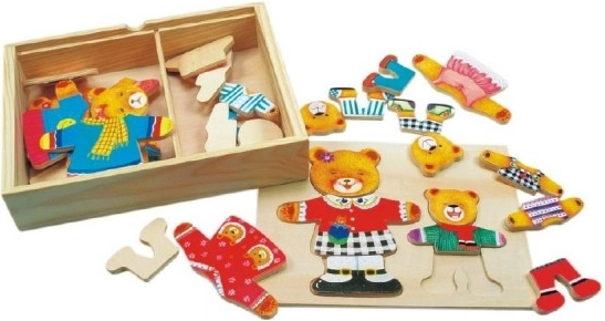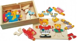 Aankleedpuzzel Bino is een geweldige hulp voor het ontwikkelen van creativiteit en fijne motoriek van kinderen. Het bevat veel kleurrijke stukken die de fantasie prikkelen bij het aankleden van de beerin en haar beertje naargelang de stemming en het weer.