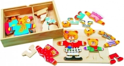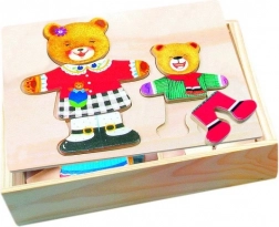 Houten aankleedpuzzel van Bino biedt zowel plezier als educatie in één praktisch pakket. Kinderen kunnen de stukken in het deksel van het doosje plaatsen en verschillende kledij voor de beren creëren volgens hun eigen fantasie.