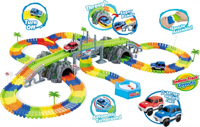 In de verpakking zitten twee batterij-aangedreven auto’s die zelfstandig rijden en soepel over de baan bewegen. Kinderen oefenen zo hun verbeeldingskracht, logisch denken en fijne motoriek. Ideaal als cadeau voor alle jonge fans van snelheid en creatief bouwen.
