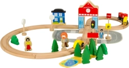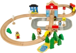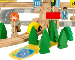 Beleef creatieve momenten met de houten treinbaan. De set bestaat uit 50 stukken die glad geslepen zijn, waardoor veiligheid en duurzaamheid tijdens het spel gegarandeerd zijn. Inclusief trein met wagon, auto's, gebouwen, figuren en stadsdecoraties, die naar wens kunnen worden gerangschikt om je eigen kleine stad te creëren.