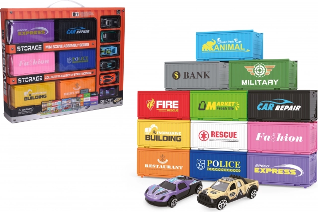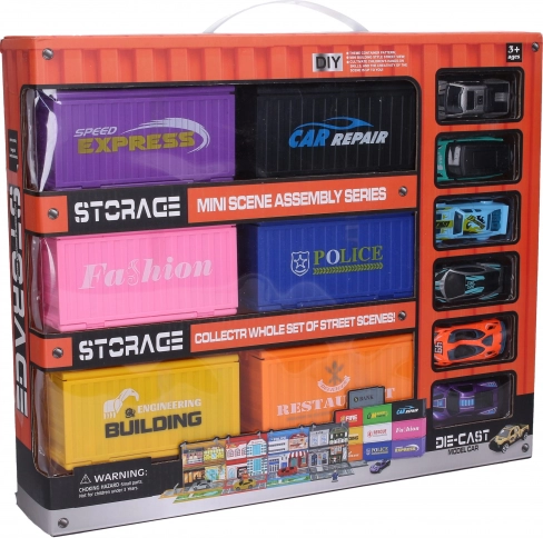 Containerspeelplaats biedt een spelervaring voor kinderen met 6 containers, waarbij elke container een auto verbergt. Deze set stimuleert creativiteit en ontwikkelt de verbeelding van kinderen.