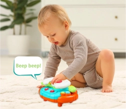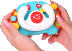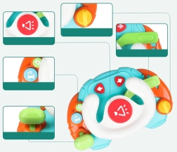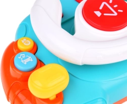 Het stuur ondersteunt de ontwikkeling van de fijne motoriek, auditieve waarneming en oog-handcoördinatie. Dankzij meerdere modi speelt het de claxon, 3 melodieën en 4 muziek- en geluidstracks af, terwijl de centrale knop in het ritme oplicht.