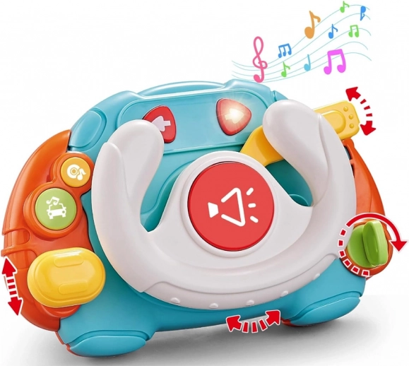 Dit kleurrijke stuur is perfect voor kinderen die graag autorijden nadoen. Realistische functies zoals stuurrotatie, schakelen van richtingaanwijzers en starten met de sleutel worden aangevuld met lichteffecten en motorgeluiden, claxon en muziek. Het speelgoed is licht, compact en past gemakkelijk in de kinderwagen of reistas.