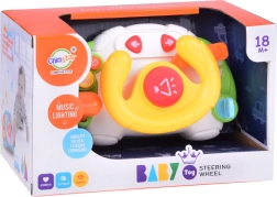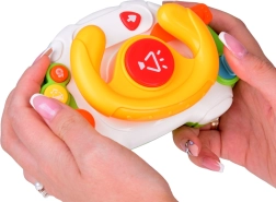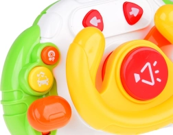 Het stuur is ontworpen om gemakkelijk in een kinderwagen of reistas te passen. Dankzij de intuïtieve knoppen leren kinderen de bediening snel: de rode knop voor de claxon, de gele voor melodieën (3 soorten) en de blauwe voor geluid en muziek (4 soorten). Tijdens het afspelen van muziek licht het midden van het stuur ritmisch op.