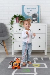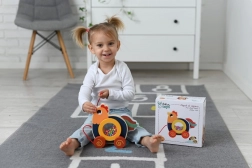 Dit kleurrijke houten speelgoed stimuleert de ontwikkeling van motorische vaardigheden en de coördinatie van handen en voeten door het voorttrekken.