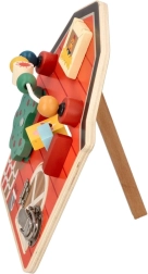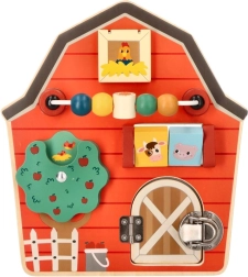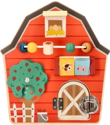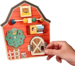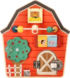 Deze houten activiteitentafel in de vorm van een schuur is ontworpen om de fijne motoriek en het speelplezier van kinderen te stimuleren. Met een kleurrijk boerderijsthema en levendige tinten is het niet alleen leerzaam, maar ook leuk voor de jongste gezinsleden. Interactieve elementen zoals schuifkralen, een draaiende boom en deurtjes met een grendel helpen de hand-oogcoördinatie te ontwikkelen.