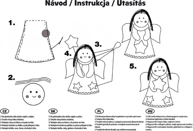 Creatieve set - engeltje - Kinderen oefenen hun vingertjes en ontwikkelen hun creatief denken. Eén verpakking bevat drie engeltjes. Elk stuk wordt origineel en uniek. Je kunt er gewoon je huis mee versieren, of kinderen kunnen ermee spelen.INHOUD VAN DE VERPAKKING:- 3 x vilt in de vorm van engeltjes- lint- vilten vulling- draad- handleiding INSTRUCTIES:1. Plaats de vulling in het vilten lichaam en naai het dicht.2. Bind het haar samen met het witte koordje.3. Lijm het haar op het hoofd en lijm dit vervolgens op het lichaam.4. Lijm de ster op het stokje en bevestig dit daarna aan het lichaam.5. Lijm de vleugels, armen, kragen en sterren op het lichaam.WAARSCHUWING:Gebruik onder toezicht van een volwassene, verwijder de verpakking buiten het bereik van kinderen, niet geschikt voor kinderen jonger dan 7 jaar, bevat kleine onderdelen, verstikkingsgevaar door inslikken.Geleverd in een kartonnen doos met ophanghaak. De vermelde prijs is voor 1 verpakking.
