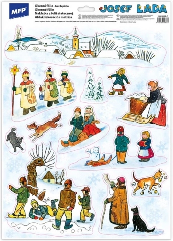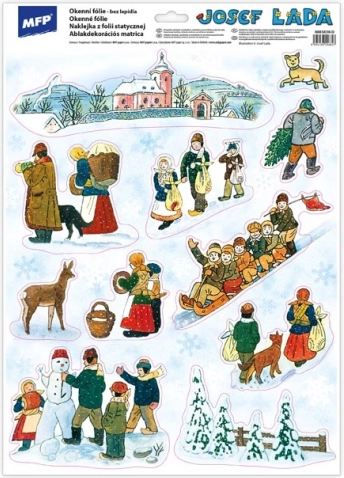 Kerst raamfolie met motieven van Josef Lada. Elektrostatisch, zonder lijm, herbruikbaar op glas en andere gladde oppervlakken. De magie van traditionele kerstdagen.