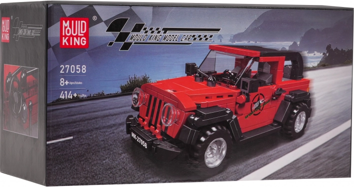 MOULD KING bouwset: rode terreinwagen van 414 stukjes van duurzaam ABS. Inclusief stickers, geïllustreerde handleiding en transparante vitrine. Leeftijd 8+.