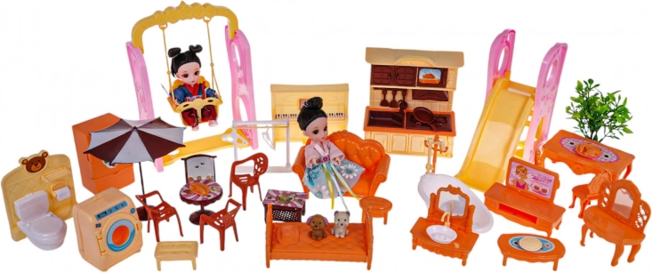 - Onderdelen van het huis en hek, auto, 2 poppen, 2 hondjes, schommel, glijbaan, parasol, keukenset, piano, badkamerset, bad, wastafel met spiegel, keukentafel, bank, bed, koelkast, kaptafel, dressoir met tv, staander met hangers (3 stuks), wasmachine, kledinghanger, poef, 2× stoel, 3× tuinstoel, 2× bankje, ronde tafel, boompje, 5× lamp, pan, 2× bord met zeevruchten, 2× spateltje, lepel, montagehandleiding