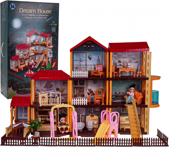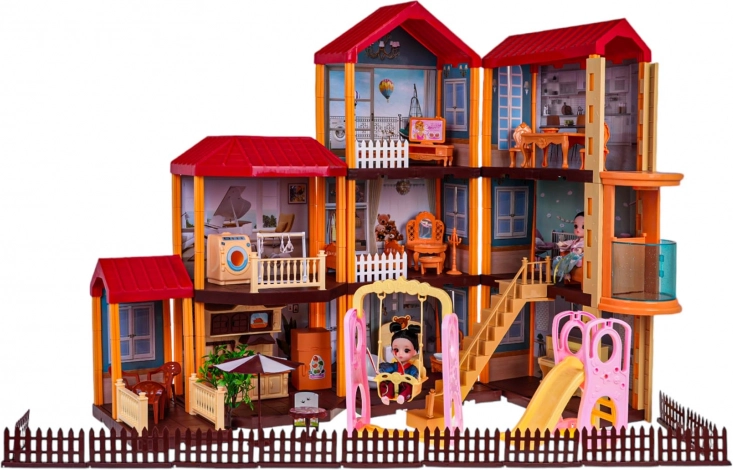 Dit ruime plastic huis in levendige kleuren biedt kinderen talloze mogelijkheden voor creatief spel. Het interieur omvat een keuken, badkamer, muziekkamer, woonkamer, slaapkamer, kleedkamer en dagkamer. Rondom het huis staat een hek met een buitenzone met zitje, parasol en speeltuin met glijbaan en schommel.