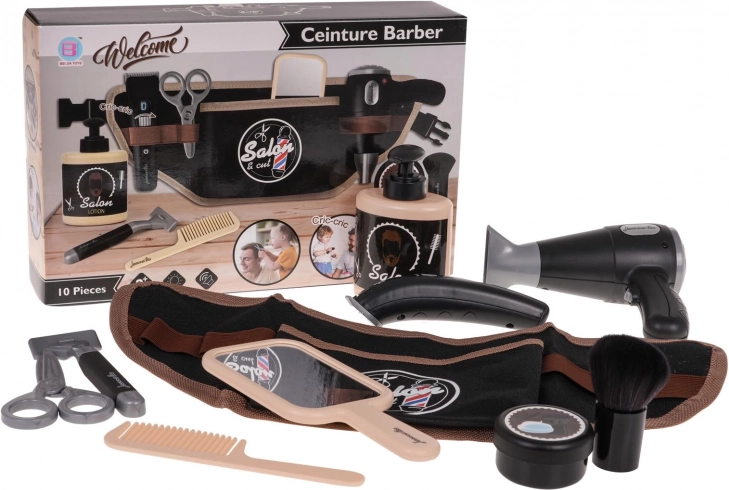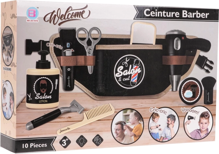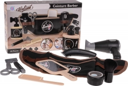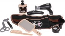 - 10-delig accessoirepakket voor realistisch spel: föhn, elektrische scheerapparaat, scheermes/scheerapparaat, schaar, kam, spiegeltje, kwast, flesje met pompje, doosje voor schuim en een riem met vakjes.
