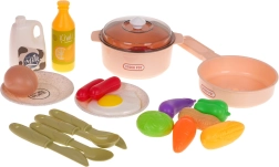 De set van 28 onderdelen bevat een pan met deksel, koekenpan, bordjes, bestek en een brede selectie etenswaren. Kinderen kunnen naar eigen fantasie ontbijt, lunch en diner bereiden.