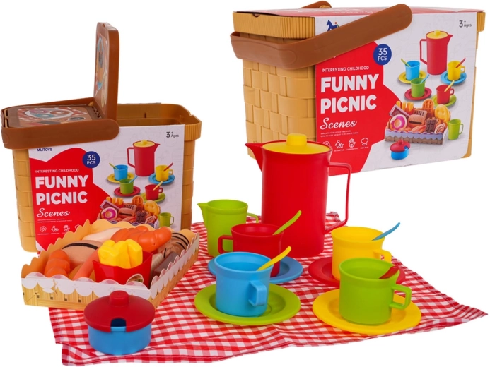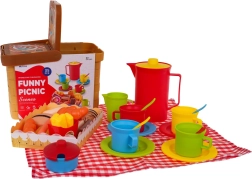 Inhoud van de set: mand met handvat, picknickkleed, kartonnen dienblad, grote en kleine theepot met tuit, 4 bordjes, 4 bekers, 4 lepeltjes, pannetje met deksel, mandje met lekkernijen (croissant, 7 koekjes, chocolade, wafel, hotdog, frietjes en ketchup).