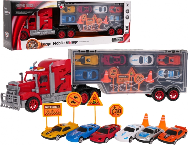 Grote set voor kleine chauffeurs: een rode vrachtwagen met afneembare oplegger die dient als praktische koffer voor 6 autootjes. Inclusief verkeersborden en pylonen voor realistisch spel. Het speelgoed is gemaakt van duurzame materialen, heeft levendige kleuren en is geschikt voor kinderen vanaf 3 jaar.