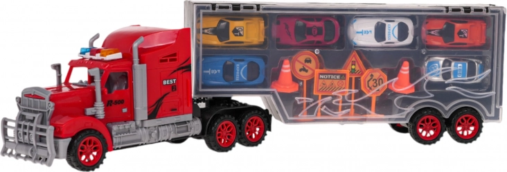 - Vrachtwagen met oplegger, 6 autootjes, 4 verkeersborden, 2 pylonen