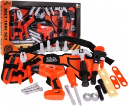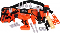 - Verstelbare gereedschapsriem; boor; 3 verwisselbare bits voor de boor; opzetstuk voor schroevendraaier; 2 verwisselbare bits voor de schroevendraaier; tang; verstelbare moersleutel; mes; hamer; 2 delen om in te schroeven; 1 “houten” deel; 2 schroeven; 2 moeren; 4 pluggen