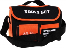 Duurzame opbergtas met handvat en schouderriem. Hoofdvak met klittenband, voorvak en binnenvakken voor overzichtelijke opslag van gereedschap.