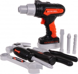 - Tas, elektrische boormachine, verwisselbare bits (sleuf, kruiskop, boor), opzetstuk voor schroevendraaier, verwisselbare schroefbits, hamer, steeksleutel–ringsleutel, tang, 2 kleinere en 2 grotere elementen om te schroeven, 3 plankjes, 3 schroeven, 3 opzetstukken, 2 pluggen