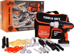 De doordachte tas biedt een hoofdvak met klittenband, een voorvakje en lussen voor gereedschap. De elektrische boormachine op 2× AA-batterijen (inbegrepen) kan vast- en losdraaien, heeft verwisselbare bits en een uitneembare accu, zodat kinderen een authentieke ervaring van repareren en monteren beleven.