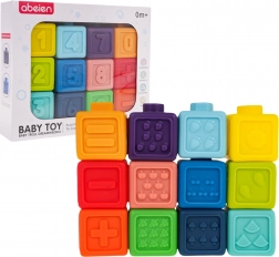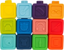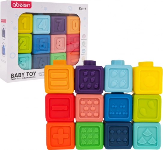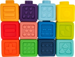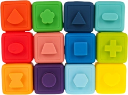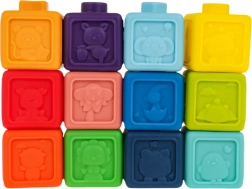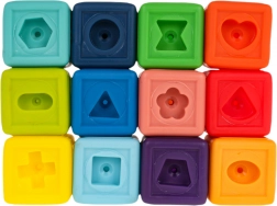 Deze veelzijdige set rubberen blokken is ideaal vanaf de eerste levensdagen. Dankzij het zachte, niet-giftige materiaal zijn de blokken veilig om op te bijten en in te knijpen en ontwikkelen ze tegelijk de zintuiglijke waarneming. Kinderen leren op natuurlijke wijze kleuren en vormen onderscheiden, trainen de grijpvaardigheid en verbeteren de oog-handcoördinatie.