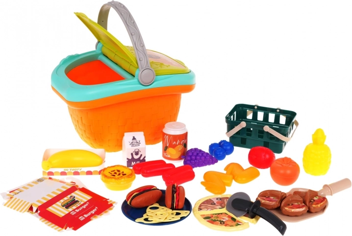 grote picknickmand met handvat, klein mandje, plastic fruit (ananas, aardbei, druiven, banaan, blauwe bes), tomaat, 2× worst, 2× kippenbout, pizza, 3× tortilla, 2× hotdog, gebakje, 2× plak kaas, blikje drank, melkpak, bordje, pizzaschep, pizzasnijder, 3× papieren dienblad, 2× burgerdoos, decoratieve stickers