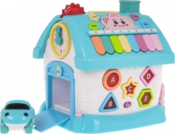 Het interactieve huisje is gemaakt van kwalitatief kunststof in aantrekkelijke kleuren en is ontworpen om kinderen op een speelse manier vormen, letters en cijfers te laten ontdekken. Elke van de vier zijden biedt andere activiteiten – van een klok met echt beweegbare wijzers en garagedeuren, via een wand met alfabet en verlichte vormen, tot voordeuren met sleutel met licht en geluiden. Er is ook een klein autootje inbegrepen voor nog meer speelscenario’s.