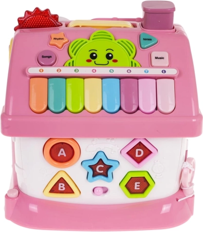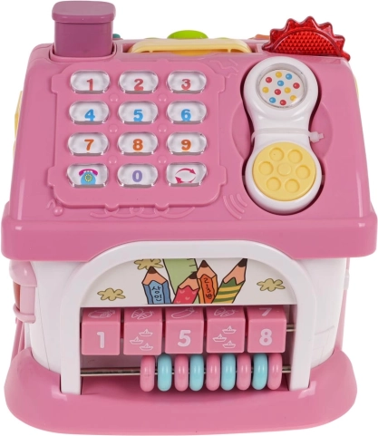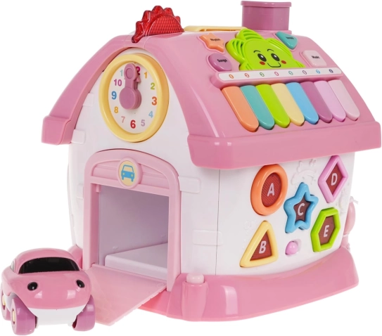 Onder het dak bevinden zich een uitneembare telefoon, een numeriek toetsenbord en een piano met acht gekleurde toetsen, waarop kinderen melodieën kunnen spelen en tonen en ritmes kunnen veranderen. De voorkant biedt een deur die opengaat met deurgeluid en lampje; de zijkanten bevatten het alfabet A–E met Engelse uitspraak en namen van vormen, draaielementen en een garage met een uitschuifbaar roze autootje.