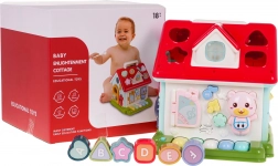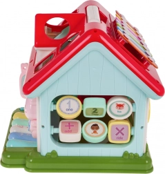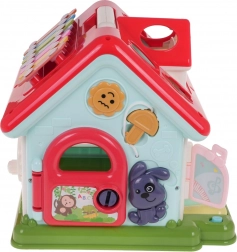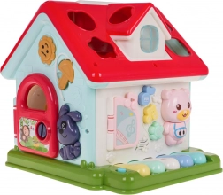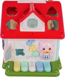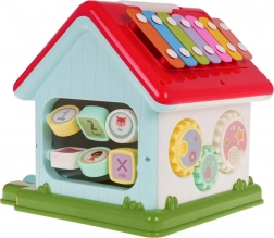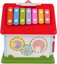 Ontdek een leuke manier om kinderen kennis te laten maken met muziek, vormen en kleuren. Het interactieve huisje combineert een pianootje met 5 toetsen (cijfers, dieren en hun geluiden, melodieën, tonen Do–So), een lichtgevend raampje en sprekende/spelende elementen met diertjes. Elke wand biedt een andere activiteit – van een deurtje met sleutel tot tandwielen en draaiende blokken met letters.