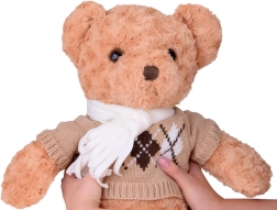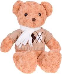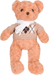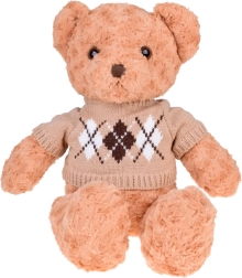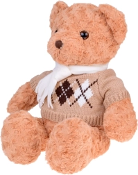 De trui met argyle patroon en de crèmekleurige sjaal van de teddybeer geven het speeltje een modieus uiterlijk. Deze accessoires verhogen niet alleen de esthetische waarde, maar benadrukken ook zijn elegantie.