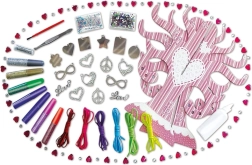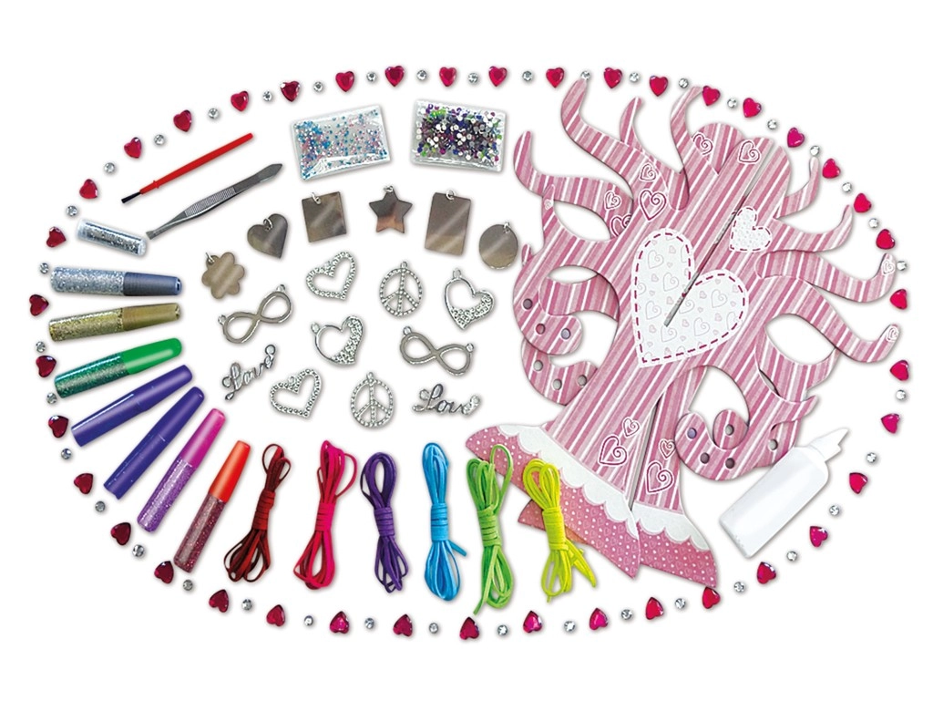 Deze complete knutselset is ideaal voor kleine sieradenliefhebbers en alle kinderen die graag hun eigen sieraden maken en dragen. In de doos vind je alles wat je nodig hebt – van metalen hangers en synthetische koordjes tot steentjes, glitter, lijm en een praktische kartonnen “sieradenboom” om de gemaakte creaties te presenteren.