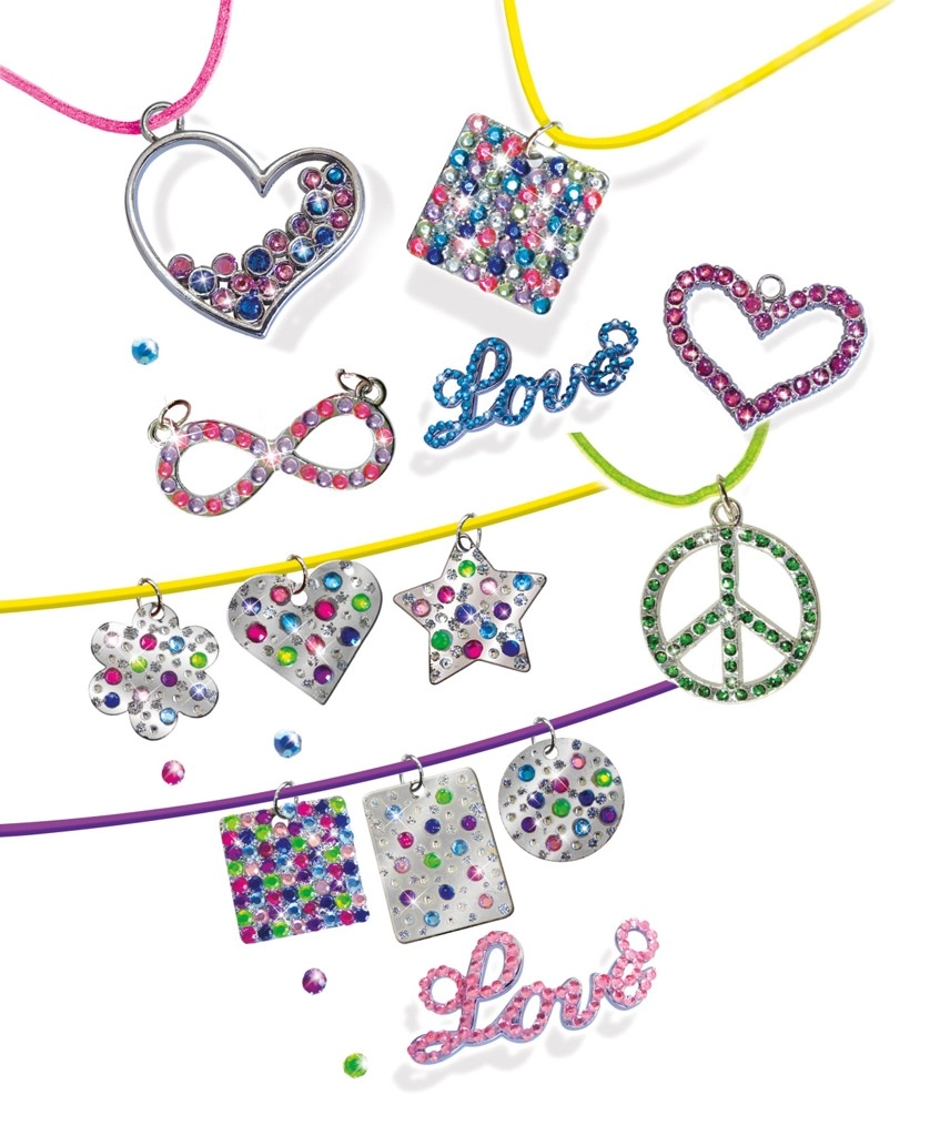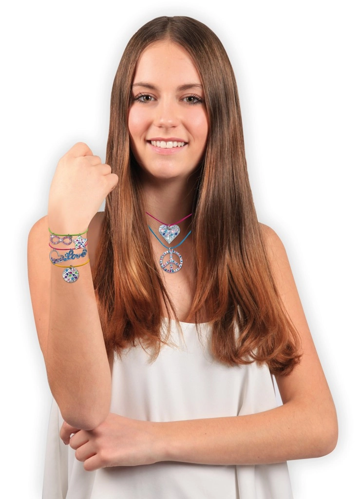 Kinderen kunnen de meegeleverde instructies volgen of volledig originele designs creëren volgens hun eigen fantasie. Dankzij de eenvoudige toepassing van steentjes en glitter is het maken leuk en goed te doen. Het resultaat zijn unieke armbanden en kettingen met hartjes, sterren en vredessymbolen die stralen van kleur.