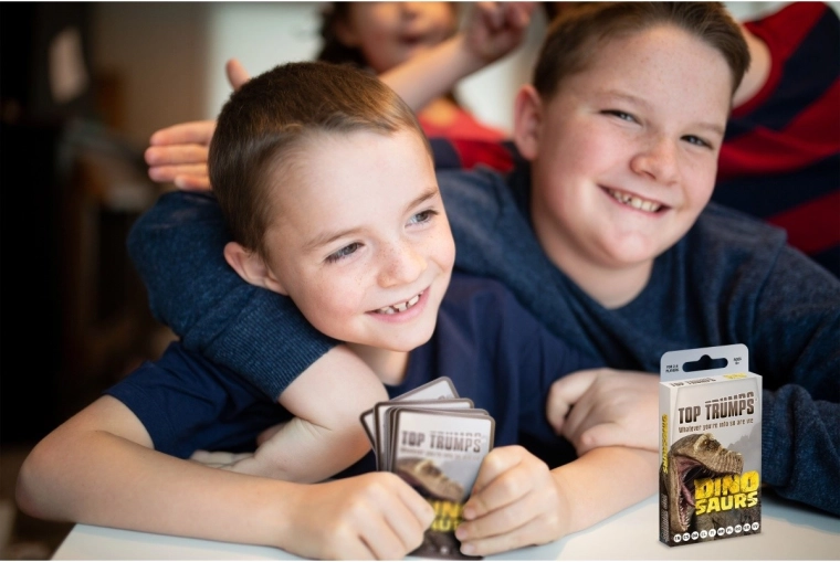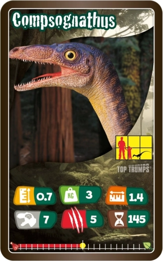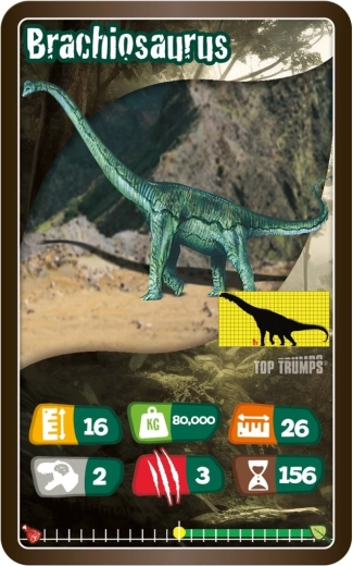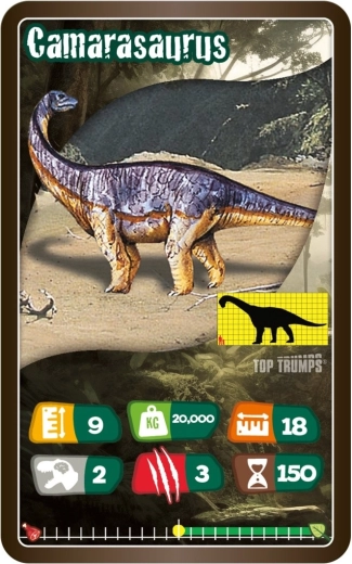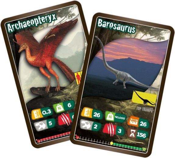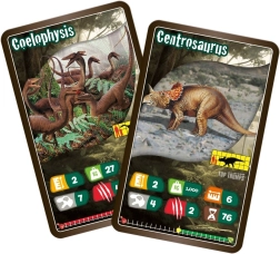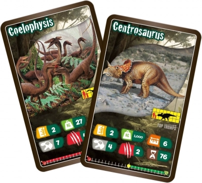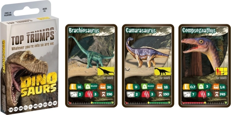 TOP TRUMPS – Dinosaurussen biedt spannende vergelijkingen van parameters van legendarische prehistorische dieren. Elke kaart bevat een boeiende illustratie en kernstatistieken, waarmee spelers slim categorieën kunnen kiezen en tegenstanders te slim af kunnen zijn. De compacte tuckbox maakt meenemen eenvoudig, zodat je het spel overal mee naartoe neemt – op uitstapjes, vakanties of bezoeken.