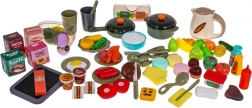 Pan, koekenpan, bestek, bordjes, klittenband-voedsel, drankjes, kruiden, krijtbord en stickers – alles voor creatief koken.