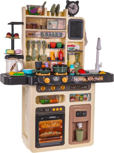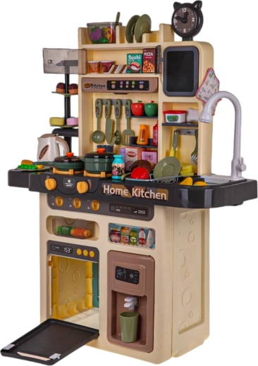 Deze ruime kinderkeuken tovert de kamer om tot een kleine culinaire werkplaats. Kinderen genieten van realistische elementen zoals verlichte kookplaten met bak- en kookgeluiden, stoom uit een van de branders en een kraan met stromend water. Open de oven, berg etenswaren op in de koelkast met waterdispenser, draai aan de bedieningsknoppen en zet de afzuigkap met muziekpaneel aan.