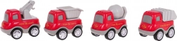 - 4 voertuigen in de set: kiepwagen, betonmixer, kraan, autootje met container