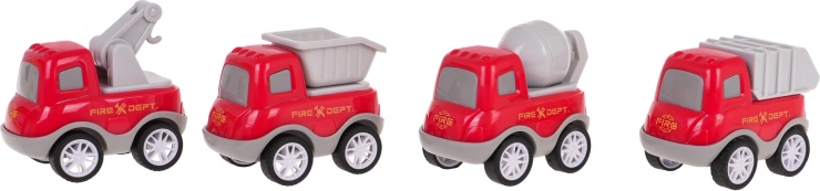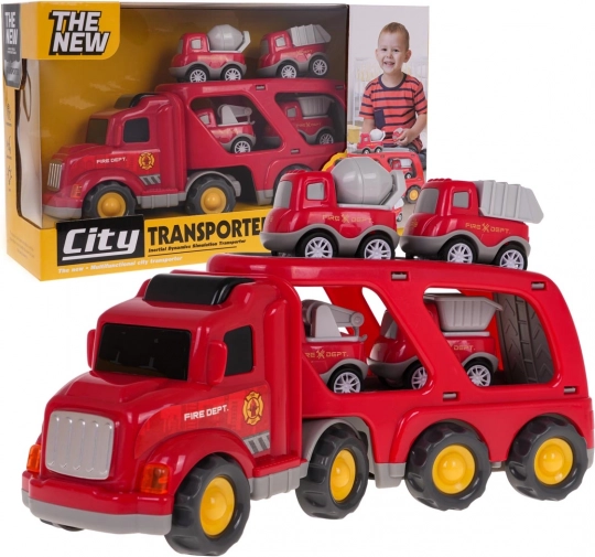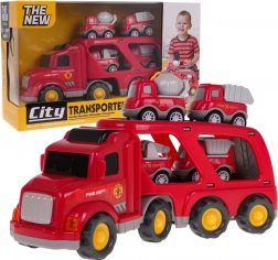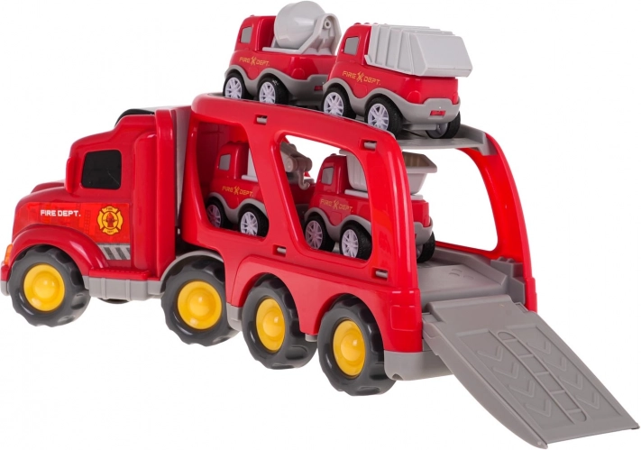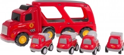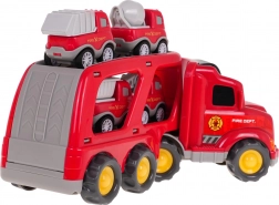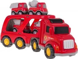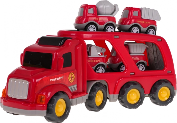 Deze gedetailleerde set brandweervoertuigen biedt kinderen urenlang creatieve speelpret. De grote transportvrachtwagen met afkoppelbare aanhanger vervoert vier kleinere werkvoertuigen. Na het indrukken van de knop op het dak van de cabine gaan de koplampen branden en hoor je authentieke start-, rij- en claxongeluiden.