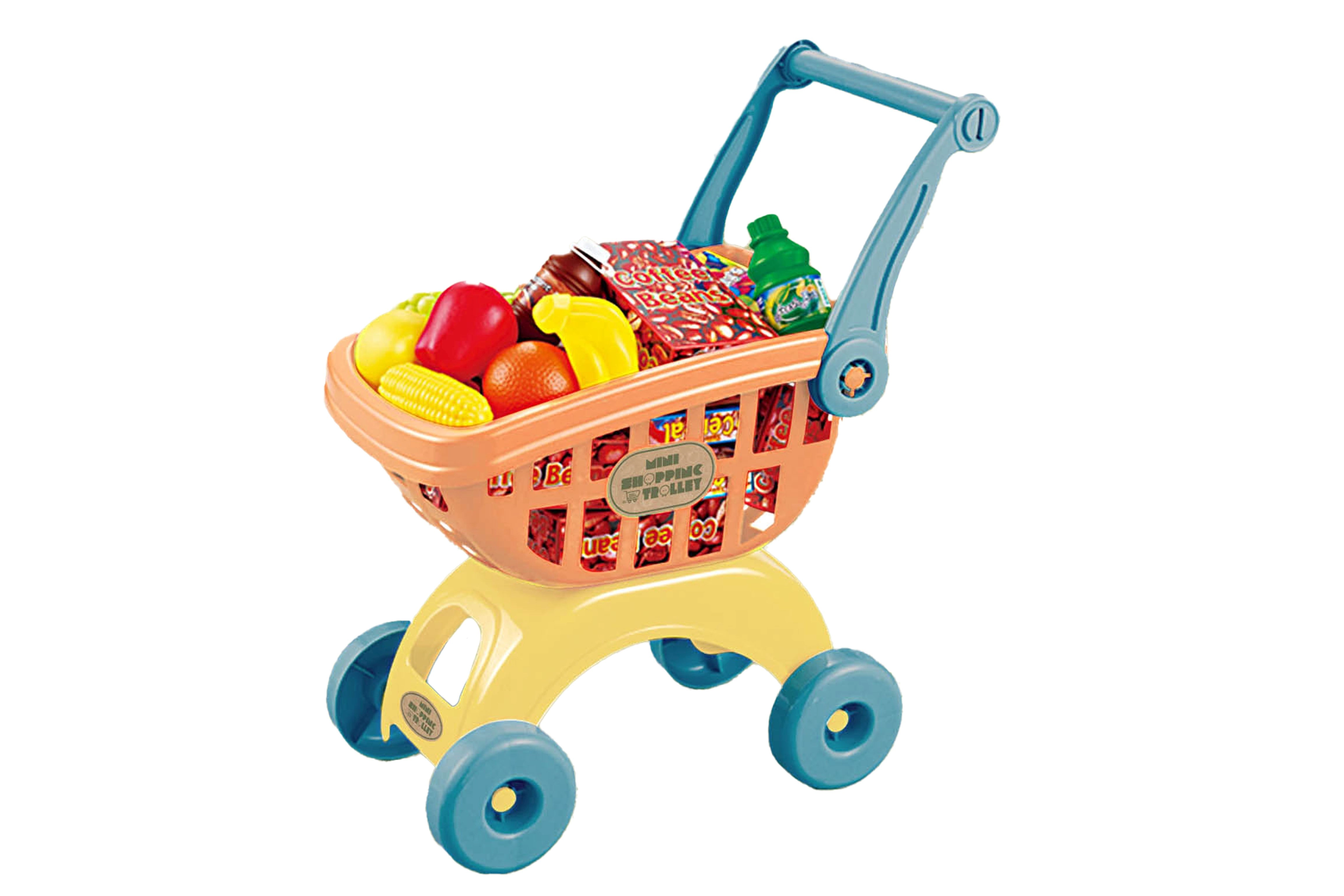 De kleurrijke trolley met wieltjes en comfortabele handgreep laat kinderen winkelen zoals in een echte winkel. Perfect voor solo- én groepsspel.